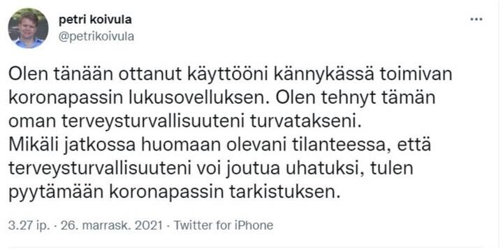 Nyt olisi varmasti tarpeen kiirehtiä sitä koronapassia työpaikoille, korona jyllää työpaikoilla ja kaataa työntekijöitä, rokotuksiakin pihdataan. Miksi se asia muuten jäi Kiurulta viimeksi kesken, kun niin kovasti sen kuitenkin olisi halunnut läpi?