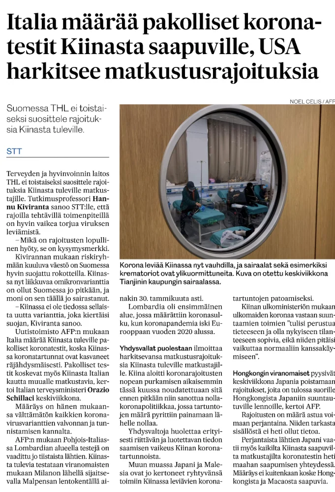 Heh. Someporina on jo suurimpien retardien keskuudessa näemmä alkanut:Milloin suomen koronahaukat alkavat vaatimaan rajoituksia Kiinasta saapuville matkustajille? Nyt on jo hetki puhuttu, että sieltä katastrofin silmäkkeestä tuodaan kammovariantteja meidän puhtoiseen ympäristöön.