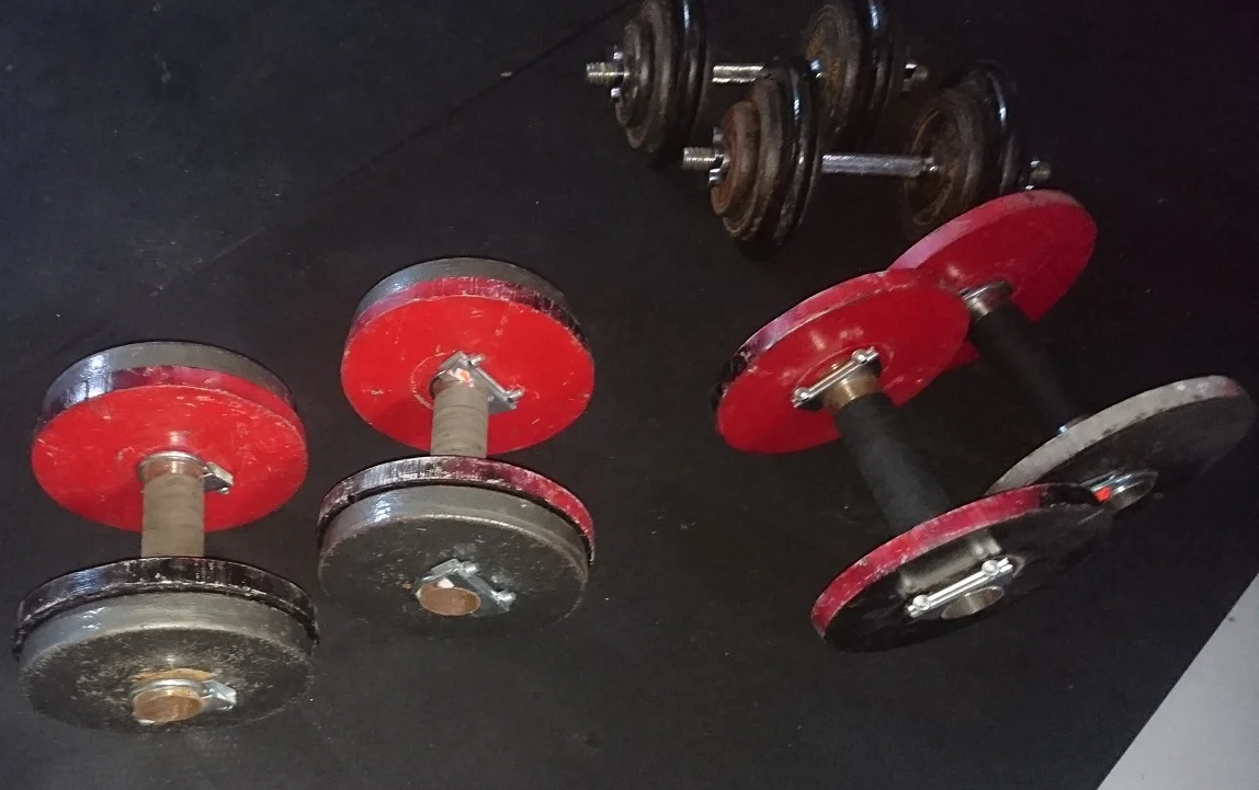 Tässä oma DIY vinkki semi-säädettäväksi fatbar käsipainoiksi jos on ylimääräisiä pienempiä levyjä kertynyt nurkkiin: 50mm huonekaluputkesta(~15e/m) sopivan mittaiset palat ja neljä 52mm (~5e yht) pakoputken klemmaria per käsipaino. Vähän mailateippia vielä kahvaan, painaa noin kilon verran putki + kiinnikkeet. Näitä voi väsätä noista alle euron kilohintaan tori.fi yms löytyvistä painoista.