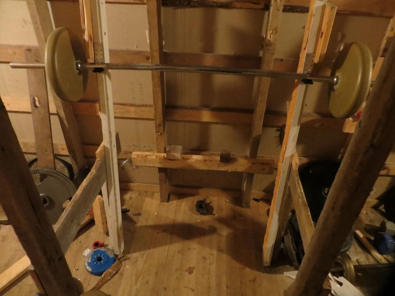 Koronataipaleella tullut rakennettua kotisali ja kun ei pitkänkään salikokemuksen avulla ole oppinut, niin uusiksi ovat menneet levypainot, levypainotelineet ja vinopenkki. Taitaa vielä kulmatanko vaihtua kohta puoliin erilaiseen.