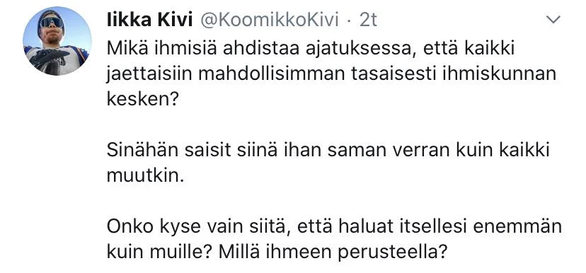 Jos väität, että koronasulut ja rajoitukset tappavat kokonaisuutena katsoen ja pitkällä aikavälillä valtavasti enemmän ihmisiä (konkurssien, itsemurhien ja tulevan sote-järjestelmän romahduttavan talouskurimuksen kautta), kuin itse suhteellisen harmiton virus (joka ei ole vuodessa tappanut edes globaalisti yhtä paljon, kuin tuberkuloosi 2020), olet itsekäs sika, joka haluaa jättää vanhukset kuolemaan.