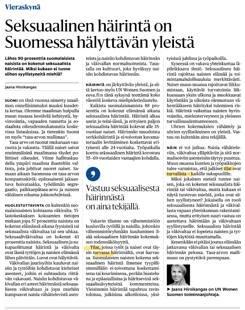 Jos Helsingin viitekehyksestä puhutaan, niin joo varmasti on miltei jokainen nainen tuollaista kokenut, mutta hankala on edes poliisin selvitellä kenen poikakulta on kysessä jossain random metroahdistelussa tai muussa satunnaiskourinnassa. Pienemmissä kylissä varmaan helpompaa.Pari naisystävää jotka asuu Helsingissä ja asuneet siellä pitkään sanoneet, että nykyään on paljon turvattomampi olo siellä. Molemmat kokeneet häirintää monella tapaa. Huutelua, ehdottelua, kähmintää, kopelointia, yritetään tulla suutelemaan jne.
