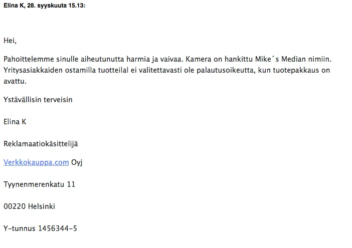 Kyllä ne pilkulleen noudatti sopimusta, jonka mäkin tiesin. Mutta silti ajattelin, että kun tuote on kuitenkin ihan samassa tilassa mitä yksityishenkilönä ostettaessa, että kai ne nyt voi vaihtaa, vaikka nyt heidän säännöissä onkin toisin. Mutta toisin kävi. Ihan vain kun voivat olla vaihtamatta, niin ovat, vaikka ihan hyvin olisivat voineet katsoa mun tiedot ja olla reiluja. Se, että sä voit tehdä jotain sääntöjen mukaan, ei aina tarkoita, että niin on fiksuinta tehdä.Eikös tässä ostossa ollut kyse ihan laillisesta sopimusehtojen noudattamisesta mihin ostotilanteessa sitoudutaan? Sopimus pätee molempiin suuntiin aina, myyjään ja ostajaan.