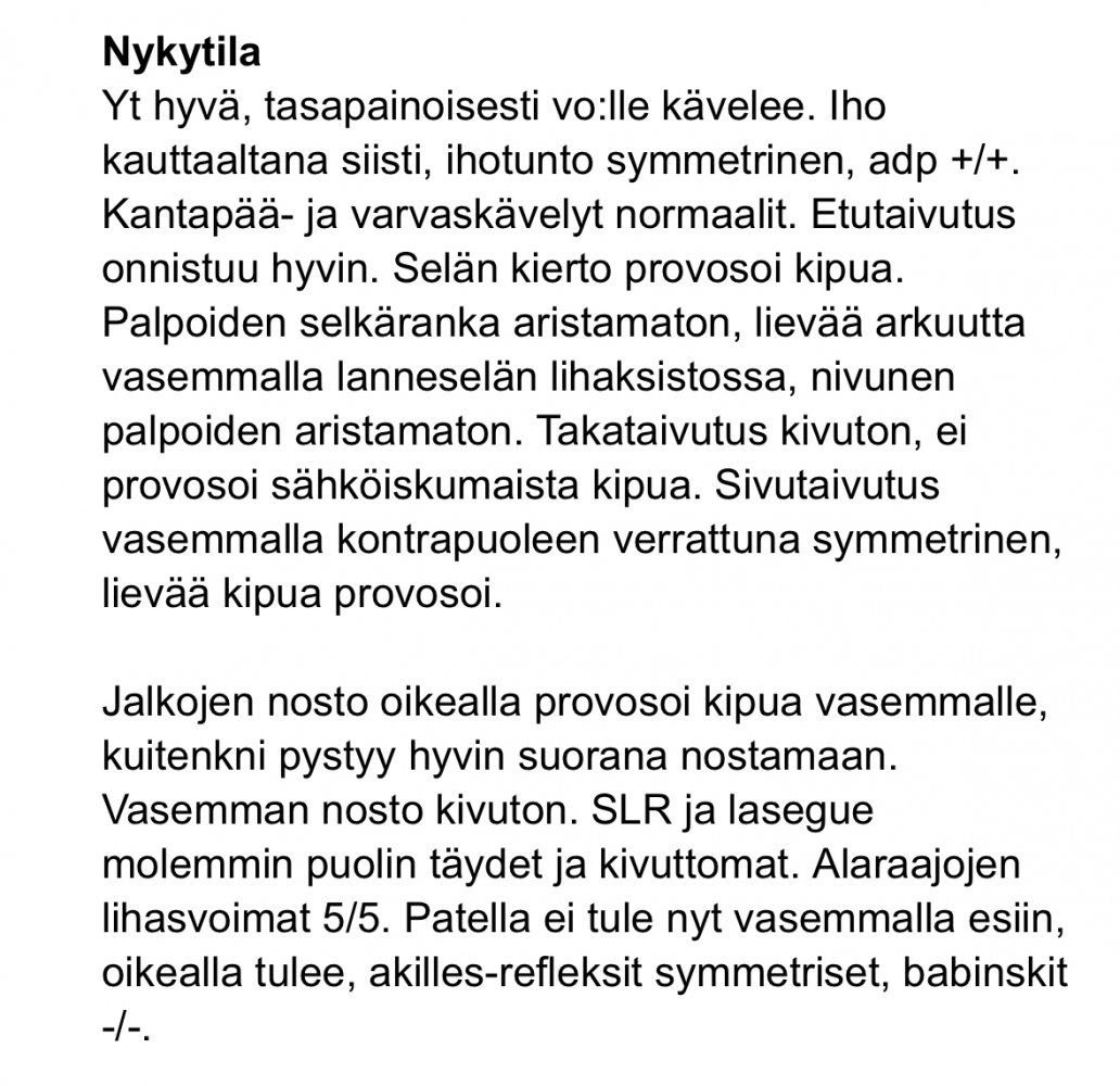 Autoon pääsen, mä voin koskea lattiaan kahdella kädellä, mutta en vain oikealla. Jos oon selällään ja koitan nostaa oikeaa jalkaa suorana, sattuu salama pakaraan, mutta jos passiivisesti se jalka nostetaan, niin ei satu.