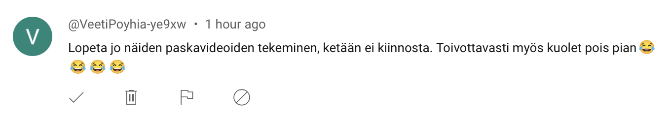 En oo kuullut, eikä kyllä kiinnostakaan. Ohan musta tehty jo deepfake pätkiäkin, syvälle tunteisiin oon mennyt joillain. Mut ei mua haittaa, toi on loputonta, joten antaa niiden tehdä aivan mitä vaan. Tubestakin vapautin kaikki bannit ja annan niiden huudella ihan vapaasti, kuhan nyt eivät chattia tuhoa. Enkä poista videoistakaan enää mitään kommentteja, näkee kaikki sitten minkälaista se on kun oot skenen vihatuin.
