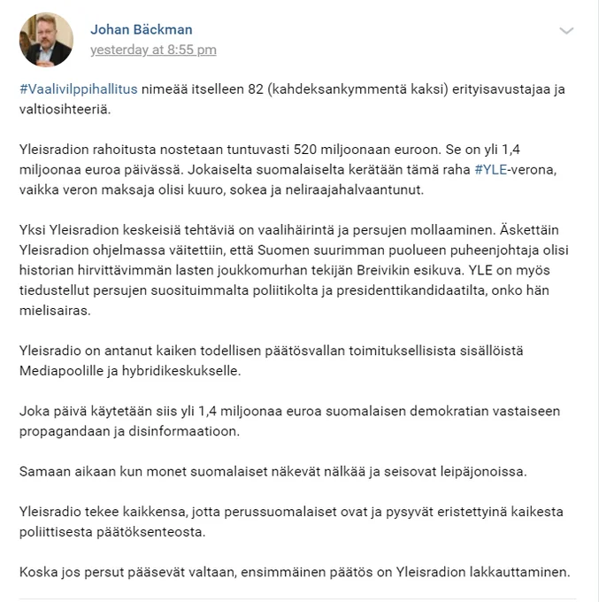Oon luullut että toi bäckman on sellainen yksinäinen susi, ekaa kertaa törmään että se puolustelee persuja.