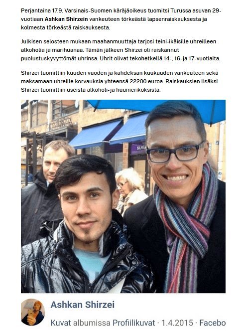 Turussa asuva 31-vuotias Ashkan Shirzei raiskasi vuonna 2020 kolme alle 18-vuotiasta tyttöä. Turun hovioikeus vahvisti tuoreella päätöksellään miehelle 6 vuoden ja 8 kuukauden vankeustuomion.