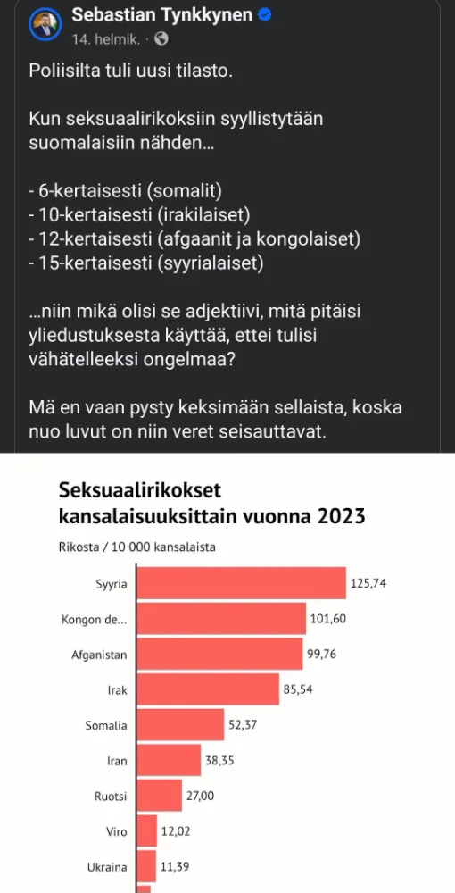 Ja näissä ei ilmeisestikään ole mukana Suomen kansalaiset, toisen polven maahanmuuttajat esim..Joku kyseli täällä hetki sitten tilastoja raiskauksista kansalaisuuksittain. Tässä 2023 tilastoa