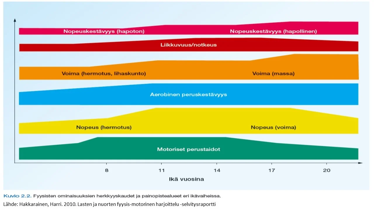 En ole mitään väärin ymmärtänyt vaan juuri noin se menee. Lajitaidoille tehokkain oppimisikä on ennen 15 ikävuotta. Sille on syynsä miksi (pääsääntöisesti) menestyneet painijat ovat aloittaneet lajiharjoittelun jo pikkupoikana. Käsikieppien, junttien ja rullien perustekniikka on vaan opeteltava silloin kun vaste on paras mahdollinen mikäli hamuaa huipulle.Olet nyt kyllä ymmärtänyt tuon esittämäsi graafin aivan väärin. Tuossa puhutaan motoristen perusominaisuuksien kehittämisestä. Tämä on sitä yleiskoordinaatiota, joka luo mahdollisuuksia kehittää spesifejä taitoja myöhemmin aikuisiällä.