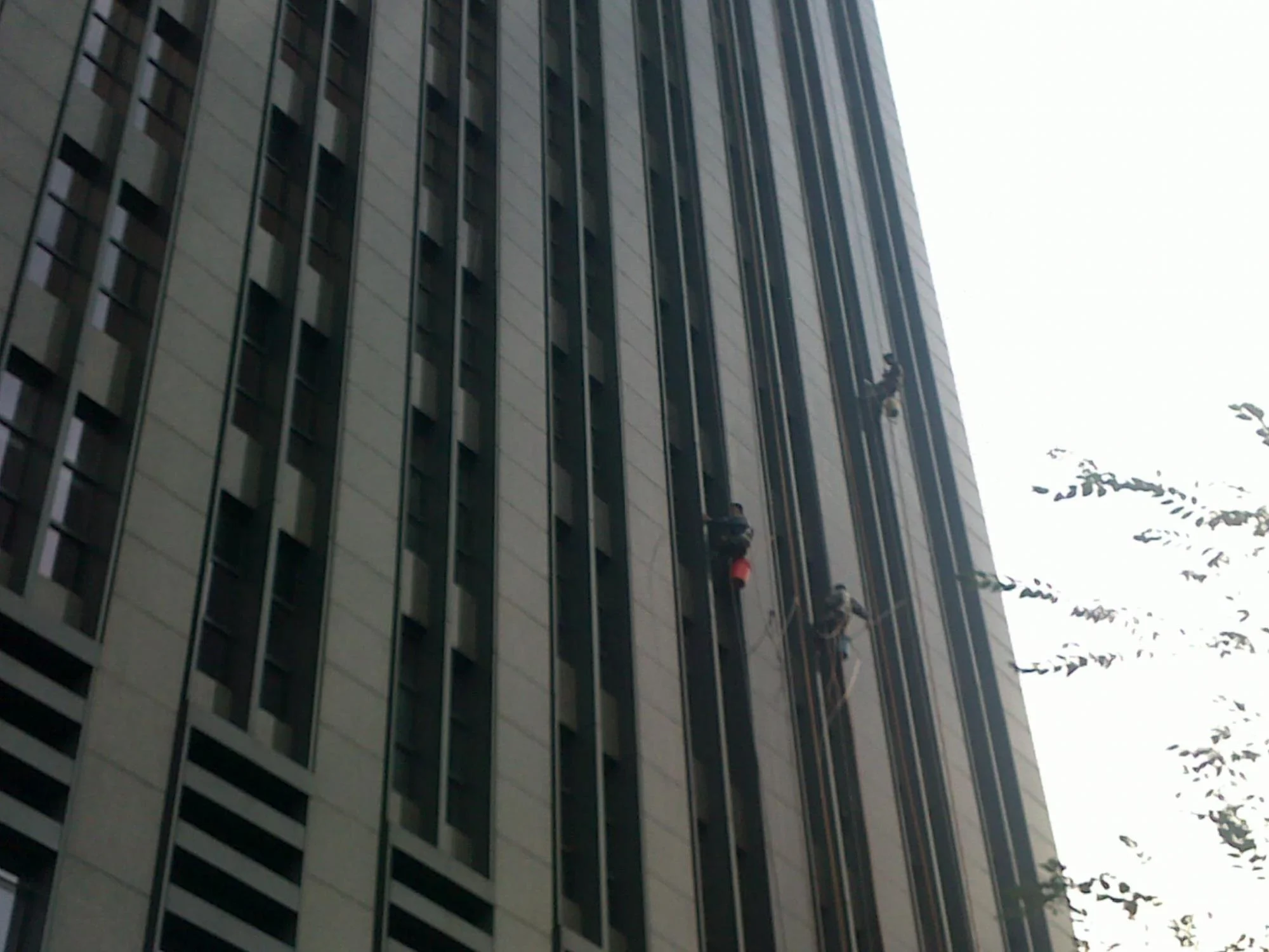 Ikkunanpesuhommia konttorilla. Parin päivän ajan heput kiikkuivat liaaneillaan tornin seinällä, ei mitään heikkohermoisten hommaa. Kiinalaiseen tyyliin varusteet ei välttämättä ole ihan viimesen päälle noillakaan hepuilla.
