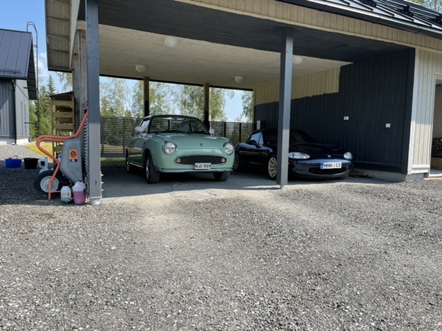 Miata ja Figaro molemmat istuimien verhoilua ja vanteiden vaihtoa vaille valmiit.