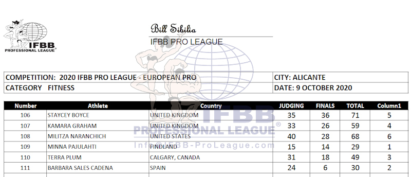 Finaalissa ei enää tehdä mitään fysiikka vertailuja. Eli kun ensin on fysiikka kierros, tämän jälkeen ei enää fysiikkaa arvioida. Muutama vuosi sitten pisteet menivät 50/50 mutta arviointia muutettiin niin että fysiikka on vain 30 ja vapari 70. Itse vähän kritisoin tätä kun kyseessä on kuitenkin fysiikkalaji eikä tanssi tai voimistelu. Se että joku on kireässä ja lihaksikkaassa kunnossa ja suorittaa vapaaohjelman on omasta mielestäni se fitneksen juttu. Ja on myös ihan eri asia jos vapaaohjelman tekee 50kiloinen voimistelija tyttö.