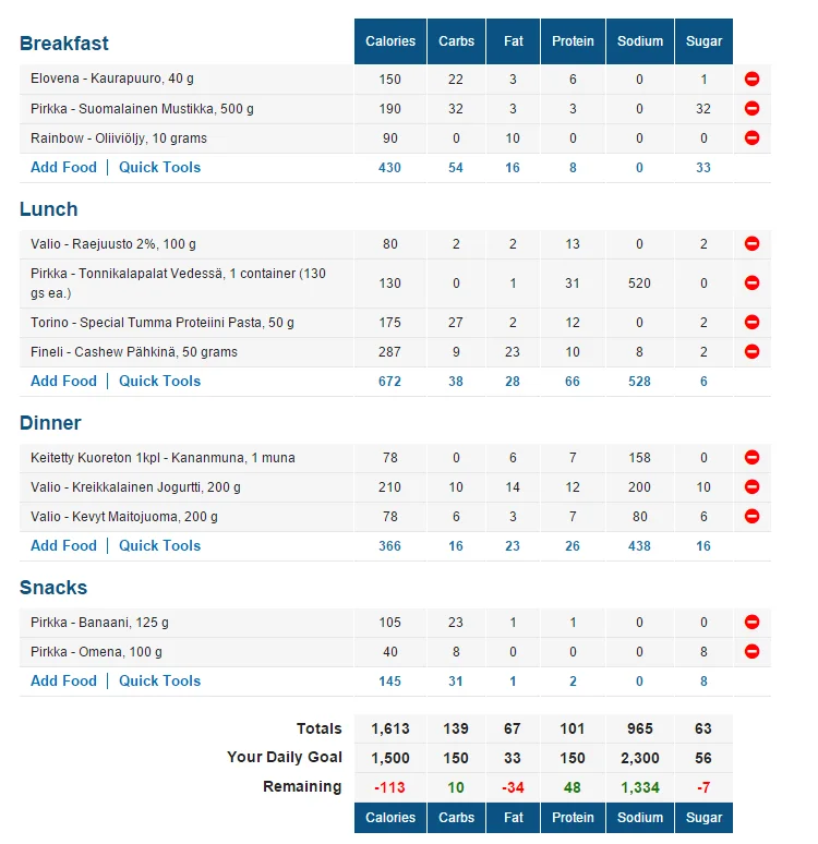 Tässä nyt dieetillä mennään noin 2400 kcal tietämissä. Tältä näyttää pääpiirteittäin päivittäinen ruokavalio. Lisukkeet ja lihat kiertävät toki jonkin verran. Treenipäivinä sitten pyöreä 200kcal safkasta korvataan treenijuomilla.