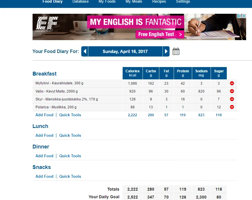 Iltapala: Yleensä samanlainen puurosetti kuin aamulla, välillä 2 palaa ruisleipää ja päälle pari siivua naudanpaistia ja tomaattia sekä kananmuna.