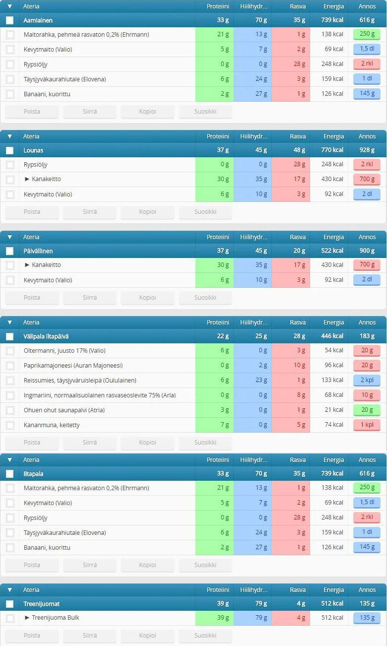 Saman ku lähes joka päivä: ~100g kaurahiutaleita maitoon tehtynä puurona, 300g makaronia, 400g jauhelihaa, 2x ruisleipää täytteillä ja 2-3 protsku drinkkiä maidolla ~3000-3300kcal. Satunnaisesti parsakaalia/kukkakaalia extrana. Dietillä maidot tai leivät pois. Joskus tuli vedettyä sitä riisiä ja kanaaki mutta nykyään ei mee enää alas. Makarooniin ja jauhelihaan ei tunnu kyllästyvän.