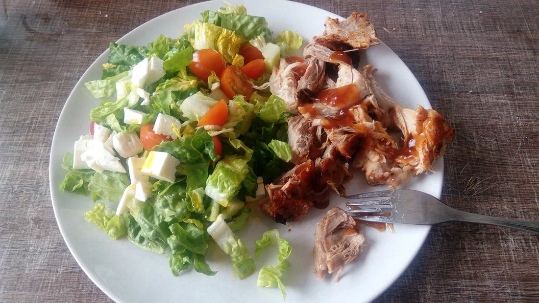 Salaattia 5% fetalla, rypsiöljyllä + 250g homemade nyhtöpossua.