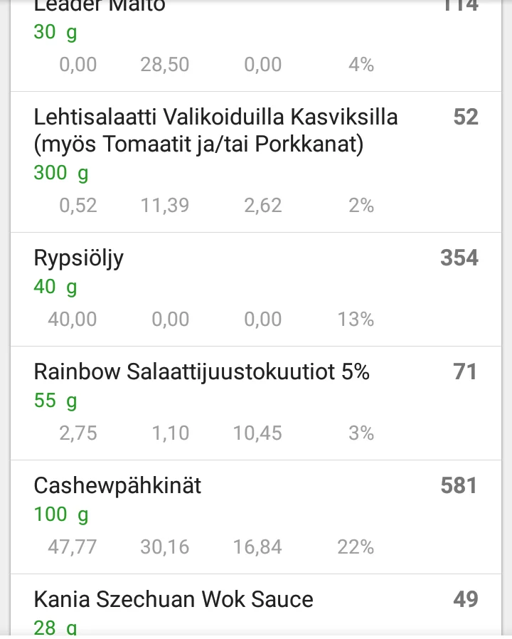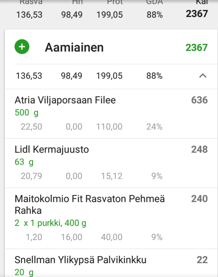 Tuota nuita voi pidemmällä kokemuksella viilata vähän suuntaan jos toiseen mutta yksinkertaiset ja hyvät arvot. Ja ruoat todellakin kannattaa laskea ja niitä seurata, jos kunnolla tuloksia haluaa.