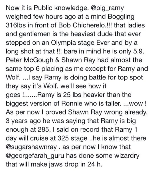 Ei toi 316 lupaa kyl mitään hyvää, huhujen mukaan se paino 315 arnold classic brazilissa ja sil kunnolla ei kyl tehä ihmeitä Olympiassa. Tai "ihmeitä" onhan Ramy top5-6 kamaa mut top3 tuskin menee