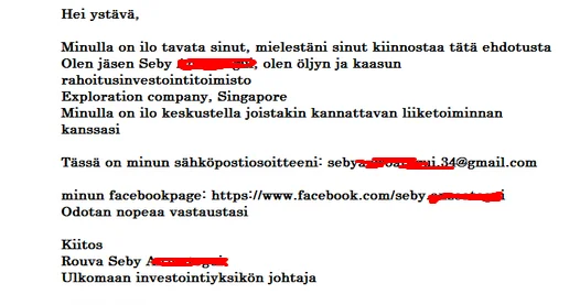 Sain puhelin Singaporesta, sikäläisestä numerosta. Joku muikki puhu hyvää enkkua ja sano, että tekee property survey in Finland.