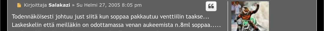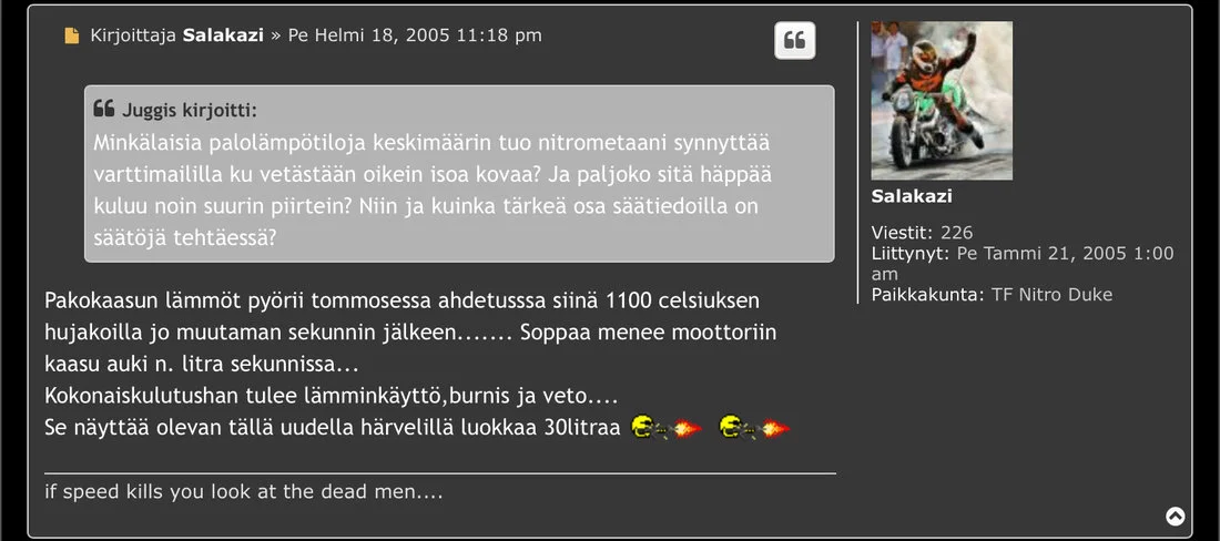 Toisen tarinan mukaan joku näistä Pohjanmaan metallifirmaperillisistä olisi ollut lähdössä mukaan nitrohommiin, mutta pyörtänyt puheensä istuttuaan ekaa kertaa pyörän selkään, kun se kävi nitrolla :LOL: