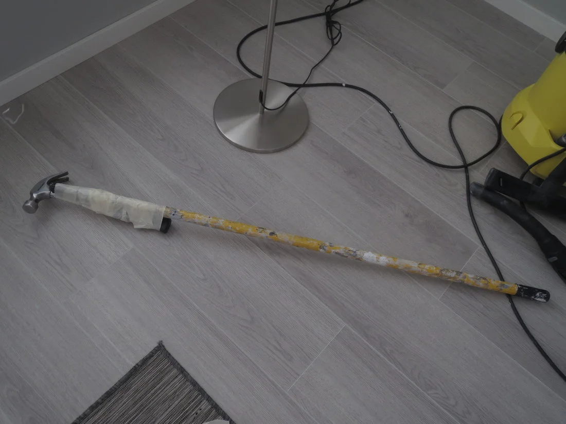 Me tarvitsisimme jonkun hyvin pitkän ihmisen, 190-200-senttisen vähintäänkin. Pitäisi tulla naulaamaan tai poraamaan koukku meille portaikon seinään, että saadaan taidetta seinälle.
