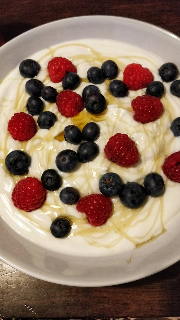 Lidlin kreikkalaista jugurttia ja paikan päältä ostettua timjamilla maustettua hunajaa.Lidlin hunajamaustettu kreikkalainen jukurtti