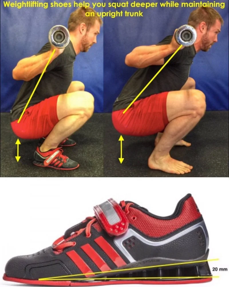Ja sen takia niitä painonnostokenkiä tehdään, että sääriluun kulma saadaan kaatumaan enemmän eteenpäin, kun kenkä toimii eteenpäin kaltevana alustana. Saman asian ajaa lauta kantapäiden alla.