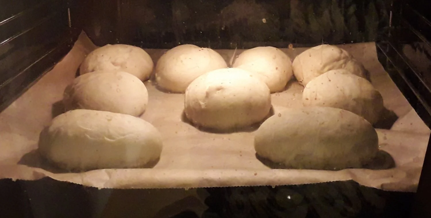 E: Pitääkin hinkuttaa uuni, noi on jotain entisen asukkaan pinttyneitä lasissa ja hiukan vettäkin kun vehnäsämpylöille täytyy antaa löylyt että tulee rapsakka kuori.
