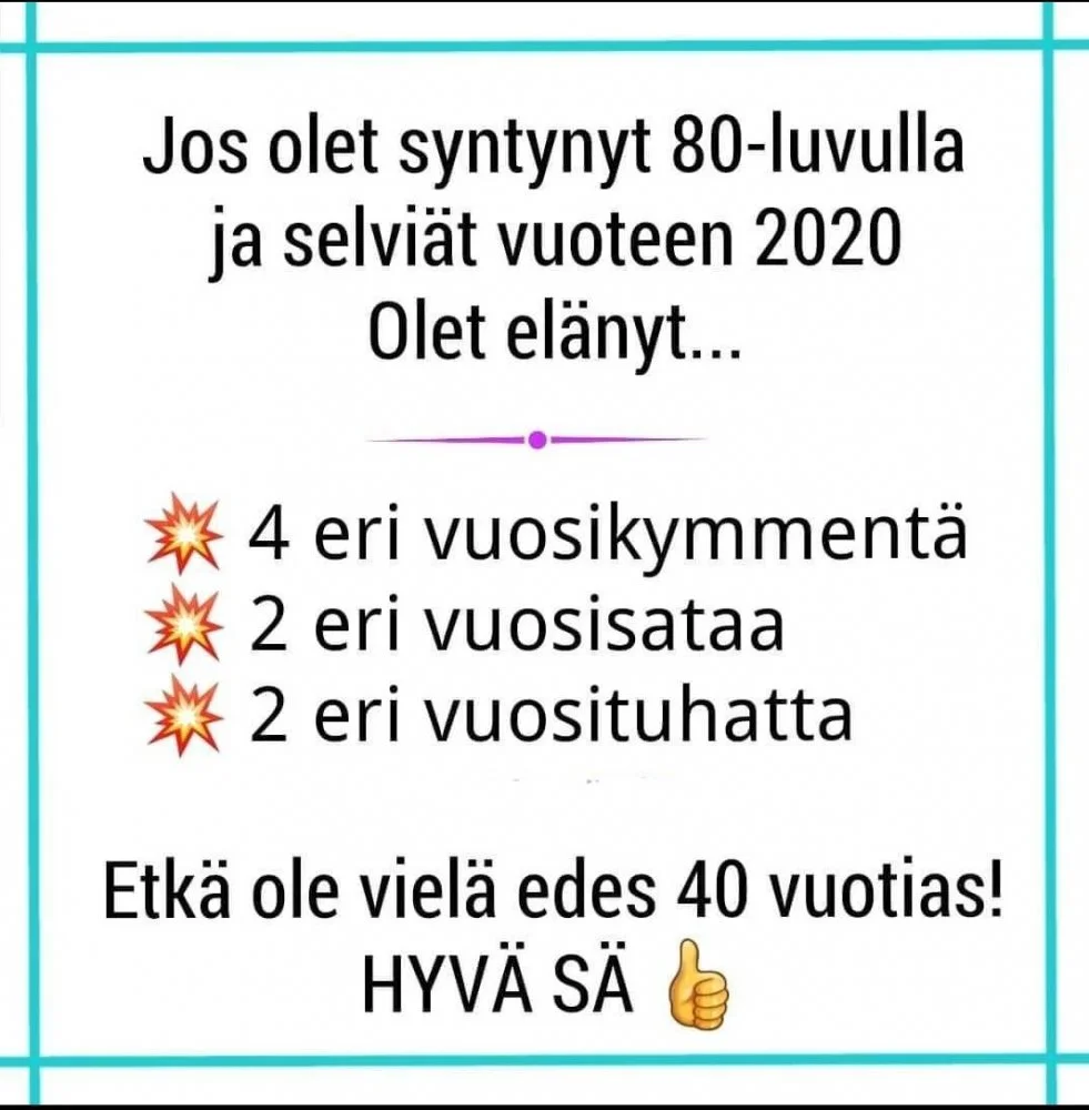 Ihmettelin ihan samaa.Juurihan oli vasta vuosituhannen vaihde, minne ne 20 vuotta meni?