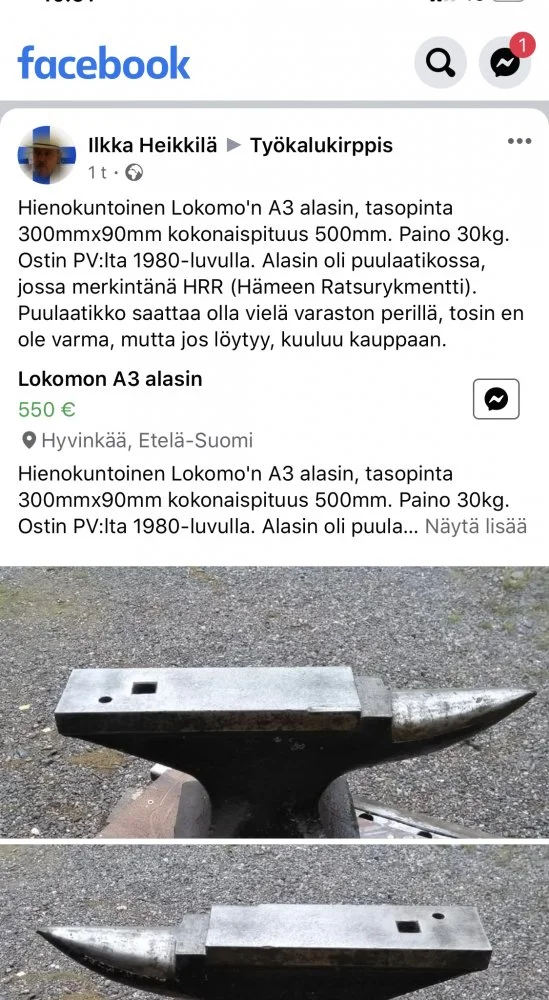 Minä haen Lokomon alasinta. Huonompikuntoisempikin käy, kunhan ei aivan lommoilla, tuo on jo aivan priimaa ja olisin valmis maksamaan, mutta ehkä 50-60 kg optimi ja siitä ylöspäin, niin on vähän leveämpi tuo selkä. Saa taottua sitten vähän isompaakin kappaletta.
