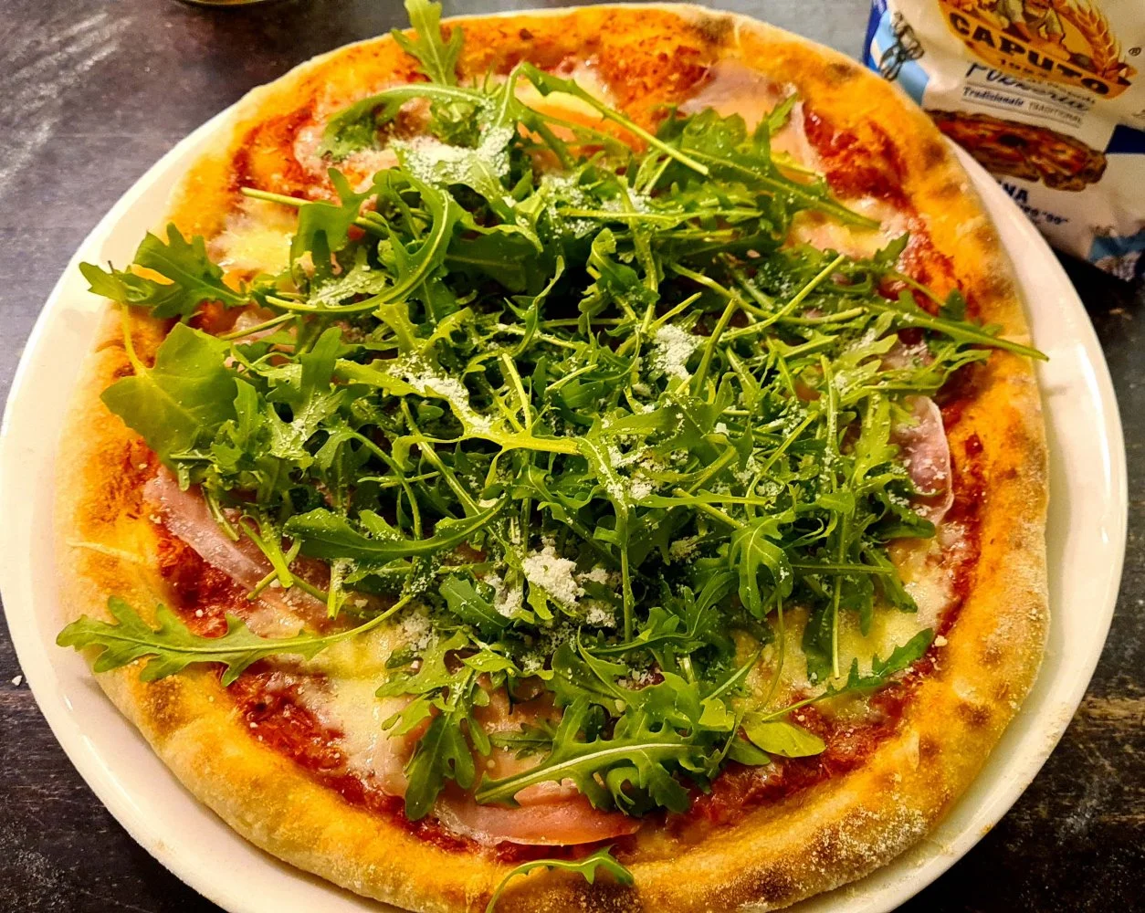 Toinen kötöstys. Paistettu margaritana ja kypsänä päälle parma, rucola, parmesaania ja kuvasta unohtui vielä kirsikkatomaatti. Oli jo menossa kitusiin, kunnes muistin.