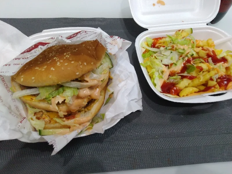 Päivän fitnessterveysiltapala, harmi ettei koko välity kuvasta mutta pihviä oli burgerin välissä sopivasti 3x120g. Hyvää ja lähti isoin nälkäkin hetkeksi.