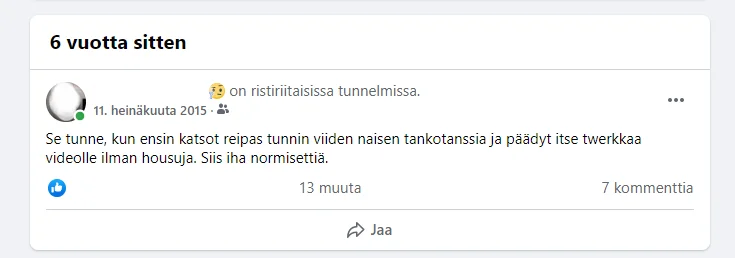 FB:n kertoman mukaan 6 vuotta sitten jalat olivat kipeät.FB kertoi että olen ollut tasan 6 vuotta sitten Jalasjärven abc:llä.