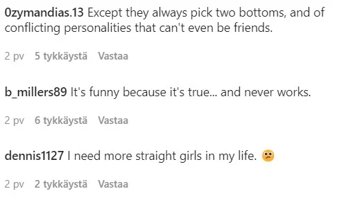 Nauroin ihan liikaa tälle. Onneksi olen niin erakko, että ei tule livenä "saatettua" ketään yhteen.