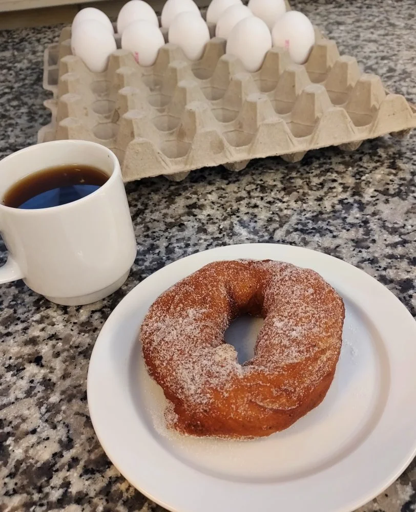 Jämäkkä aamiainen: musta kahvi, munkki ja 12 (?) raakaa kananmunaa.