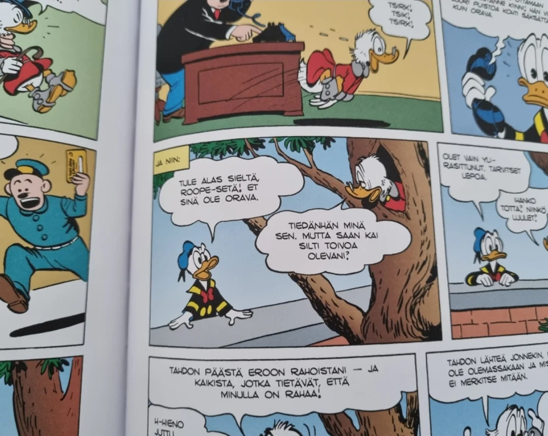 Yhdestä ruudusta muistelisin Barksin tarinaa...vuorille etsimään joku onnellisten laakso tms? Tralalaa?Tuo Aku ja Roope -sarjakuva oli oikeesti hyvä.