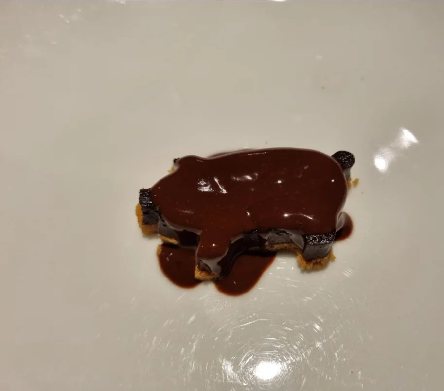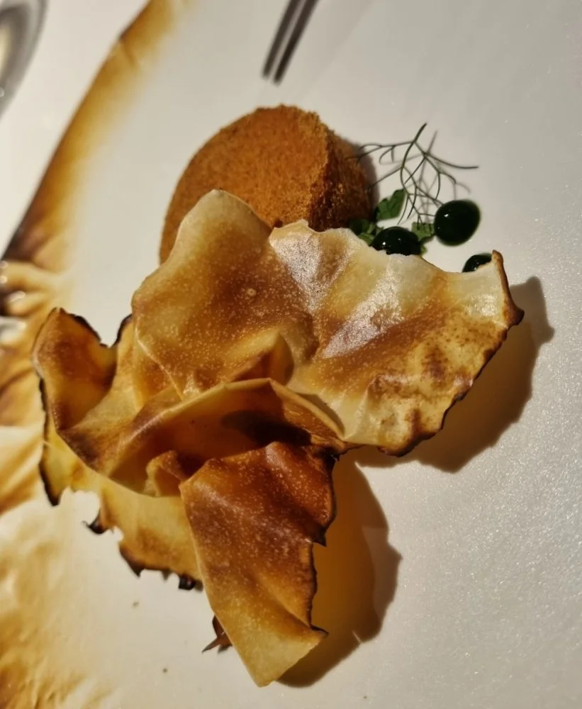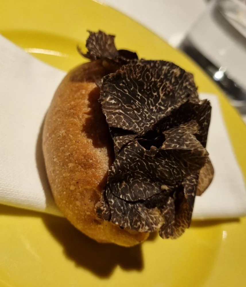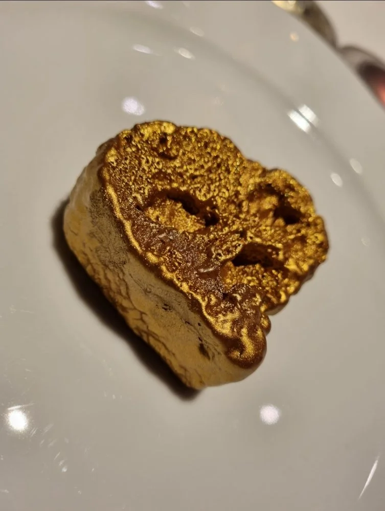 Peruna joka halusi olla tryffeli.. Leipää (jauhot ilmeisesti loppuun asti kuivattua pottua, täytteenä pottua, hasselpähkinää, tryffelimössöä), tryffeliä päällä.