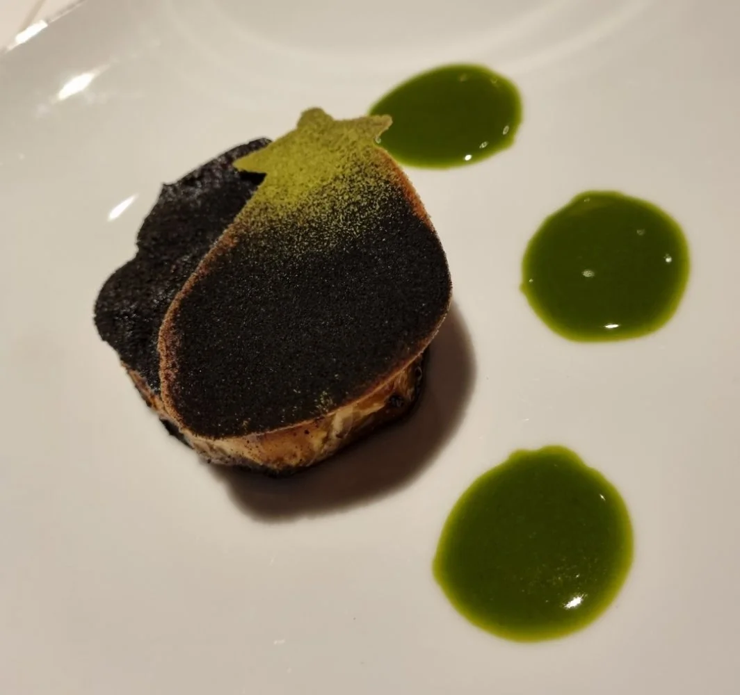 Kalaton. Palannut munakoiso. "Sisäfileen tapaan" kypsennetty kasvispihvi. (Sous vide + pannu munakoisolle). Miten palaneen mausta saadaankin miellyttävä?