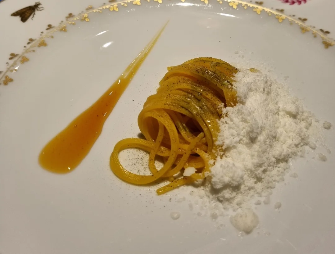 "Kala." Pasta keitetty parmesan-anjovis-sinappi vedessä, majoneesia, balsamicoa pancettaa.