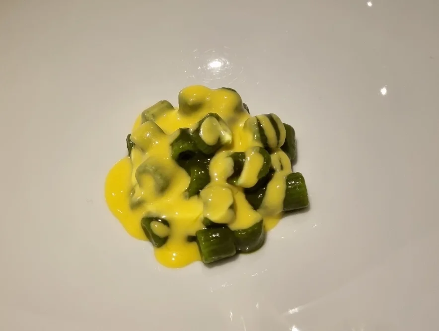 Spagettia (keitetty tomaattivedessä), tomaattigeeliä, mozzarellagranita.