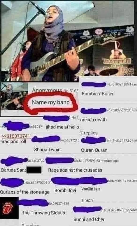 The Notorious Pig. Iran Maiden. Caliphate's Warning. Pill Grim Image. Mosque Vadis. Guns & Rosaries. Arabber's delight. Rob Bombie. The 2001 pilots. Veil Victis. Infidel Castro. Muslim Shady. Camel Tsatsouline. Turban Legends.