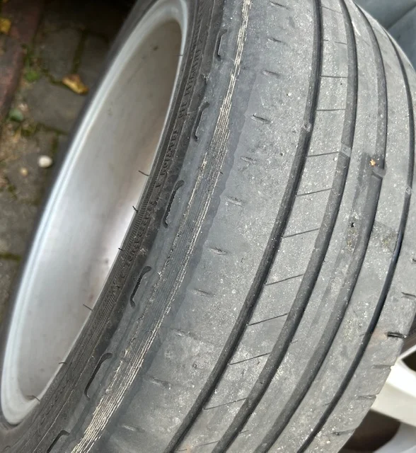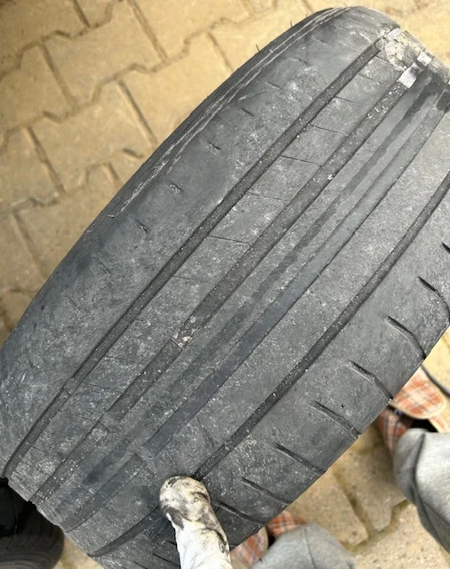 Kaikki pyörät enemmän/vähemmän saman näköiset sisäreunasta. Sinällään yllättävää, kun luulisi että jos kulmat heittää, niin ei yhtäaikaa ja samalla tavalla kaikki. Anyway, tarkistukseen ja säätöön.Näyttää että ois ottanut johonkin kiinni.