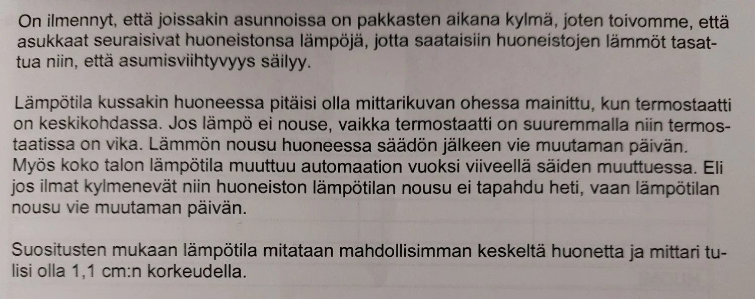 Taloyhtiöltä tuli lappuset, että pitäisi nyt tammikuun aikana mittailla kaikista huoneista sisälämpötiloja ja vieläpä niin tarkoin, että mittari pitäisi olla keskellä huonetta ja 1,1 cm korkeudella lattiasta.