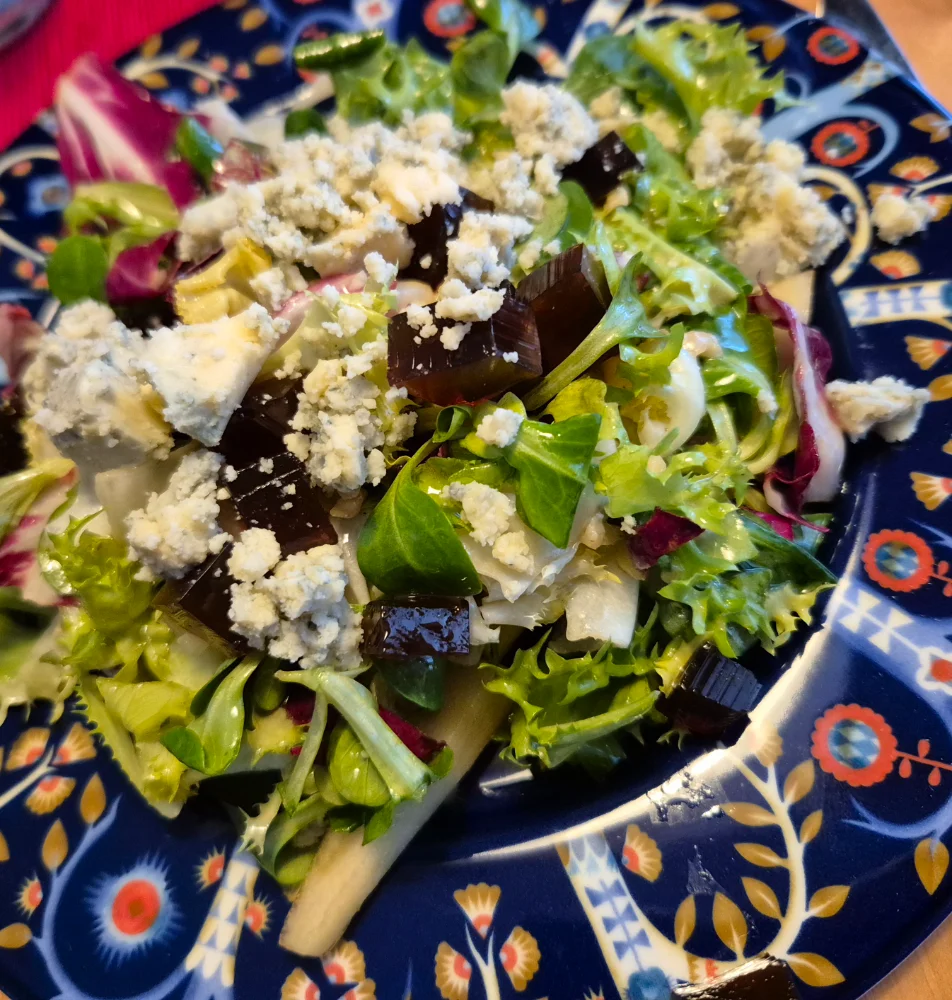 Hestonin kirjasta salaatti. Vähän epäilytti vääntää jotain sherryhyytelökuutioita, sherryssä liotettuja päärynöitä ja stiltonia, mutta oli kyllä hyvä, ei pääse mihinkään.