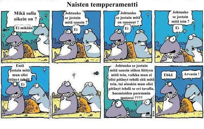 Naisen logiikka on maailmahistorian suuria mysteereitä. Kaikki mitä te sanotte, tarkoittaa loppupeleissä joko ei, kyllä tai ehkä. Siinä sitten putkiaivoiset miehet arpoo, että mikähän vaihtoehto sattuis vähiten.