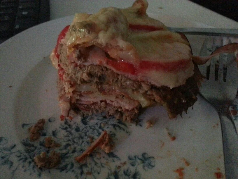 Jauhelihapihvi, pekoni, sipuli, kinkku paprika, juusto ja 2x päällekäin tuo ;)