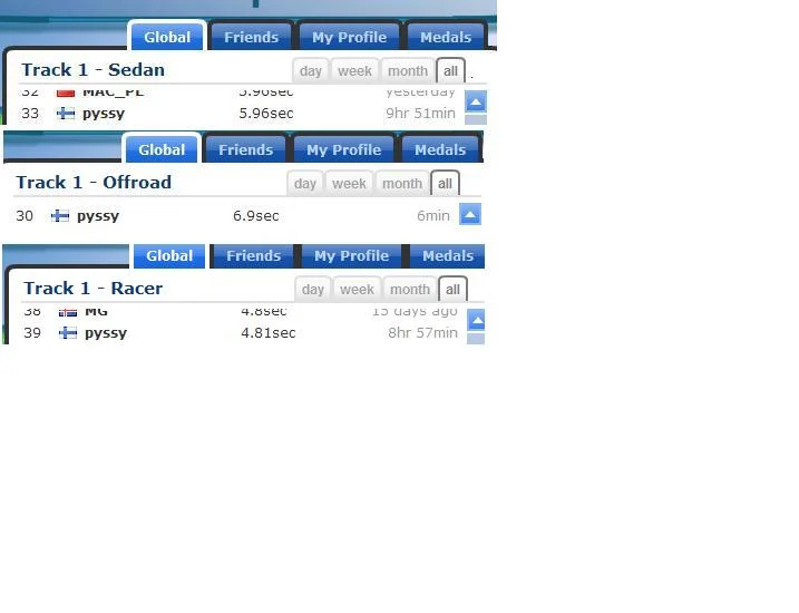 Bläh, miksi löysin tämän. Tulipa testattua pari kertaa ja rata yksi sedanilla 6.14, sija 18 (tältä päivältä siis, alltimeen top50 ei pääse tuolla).