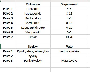 Lepopäiviä en ole nyt tarvinnut, mutta otan niitä kyllä aina tarvittaessa, eli en pakota itteeni joka päivä reenaa, mutta kun on maistunut, oon antanut mennä. Satunnaisesti otan vähän tiukempia sarjoja, mutta pääsääntösesti semmostä perushommaa eli 1-3 toistoa varaa / sarja. Nousu on ollut penkissä todella hurjaa nyt.