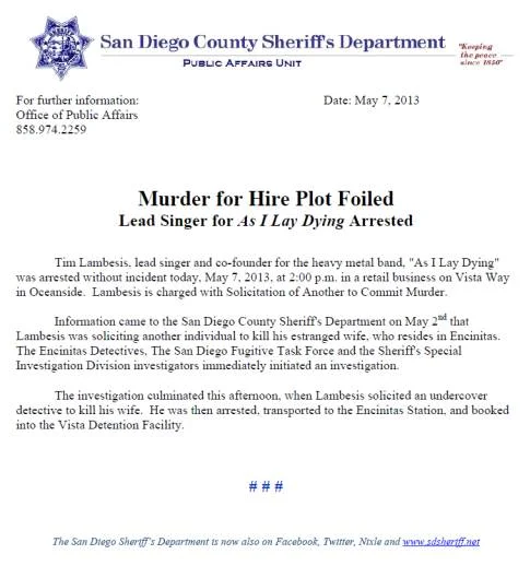 Yhdysvaltalaisen metalcorebändi As I Lay Dyingin laulaja Tim Lambesis on pidätetty vaimonsa murhan järjestämisestä.