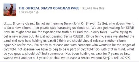 Serj Tankian viivyttelee uuden System Of A Down levyn tekoa?